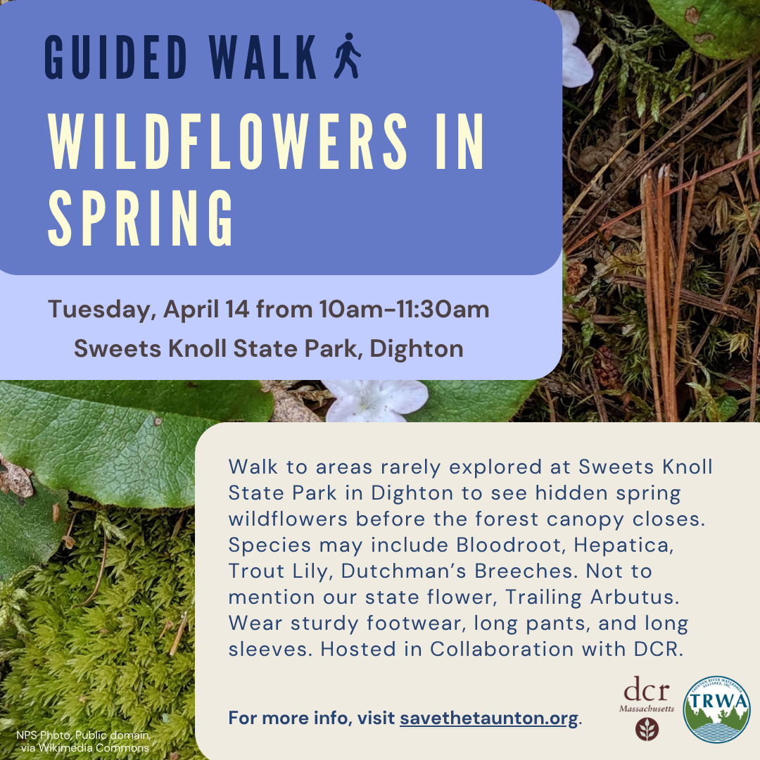 Join TRWA volunteer guide, Ellenor Simmons! Walk to areas rarely explored at Sweets Knoll State Park in Dighton to see hidden spring wildflowers before the forest canopy closes. Species may include Bloodroot, Hepatica, Trout Lily, Dutchman’s Breeches. Not to mention our state flower, Trailing Arbutus. Wear sturdy footwear, long pants, and long sleeves. Registration required.