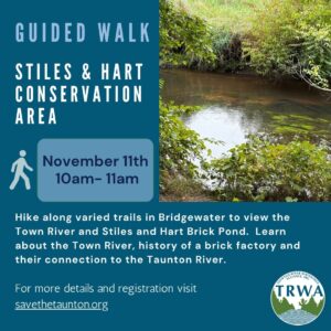 Known for its’ history of clay mining and brick production, the Stiles and Hart Conservation Area was also home to the Plymouth County Agricultural Society Fair in the early 1800s. The walk will go along varied trails to view the bordering Town River and Stiles and Hart Brick Pond. We will learn about the Town River, the brick factories and their connection to the Taunton River. Sturdy footwear recommended. No restrooms available.