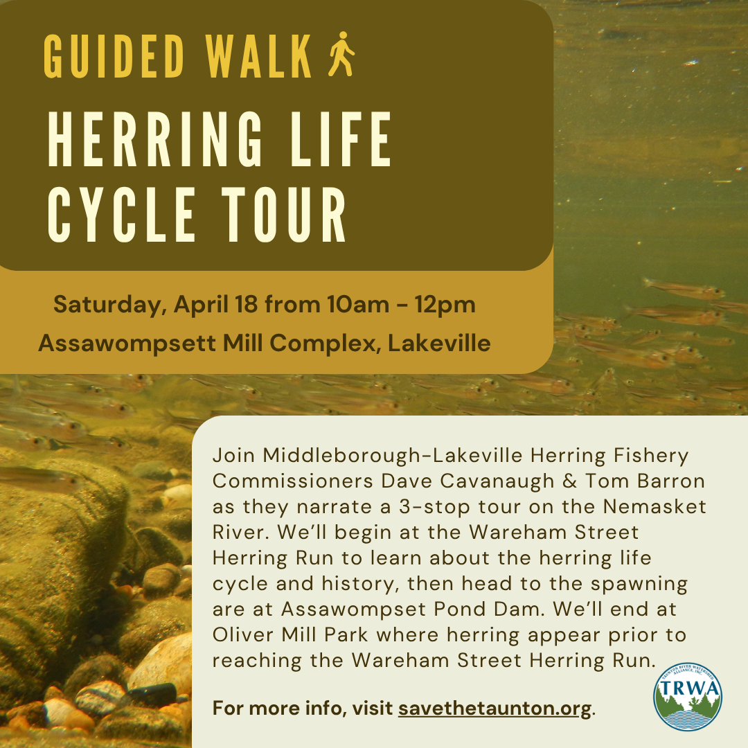 Join Middleborough-Lakeville Herring Fishery Commissioners Dave Cavanaugh & Tom Barron as they narrate a 3-stop tour on the Nemasket River. We’ll begin at the Wareham Street Herring Run to learn about the herring life cycle and history, then head to the spawning are at Assawompset Pond Dam. We’ll end at Oliver Mill Park where herring appear prior to reaching the Wareham Street Herring Run. Registration required.